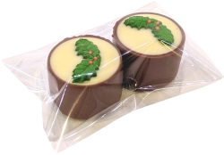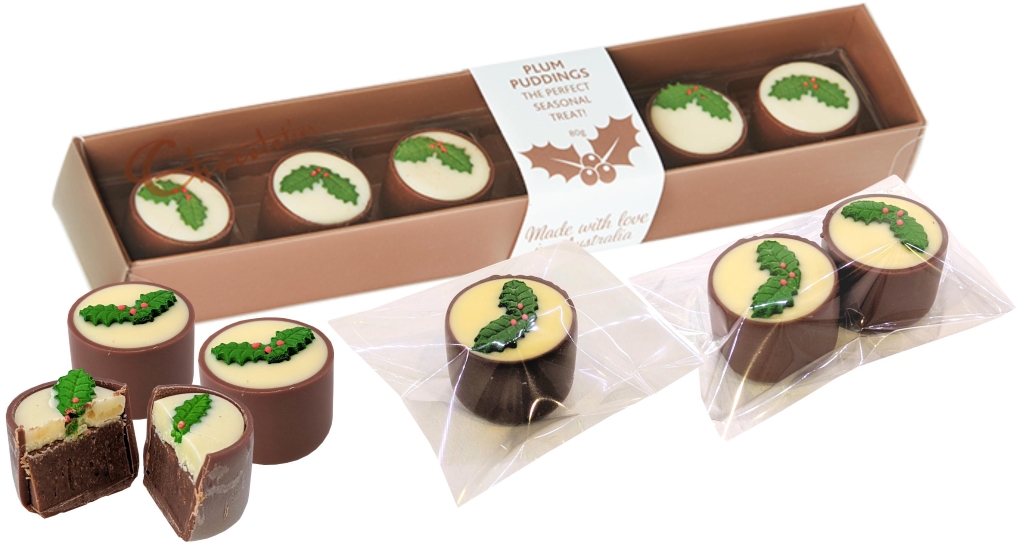 Real milk chocolate xmas puddings, decorated with white chocolate and icing 'holly'